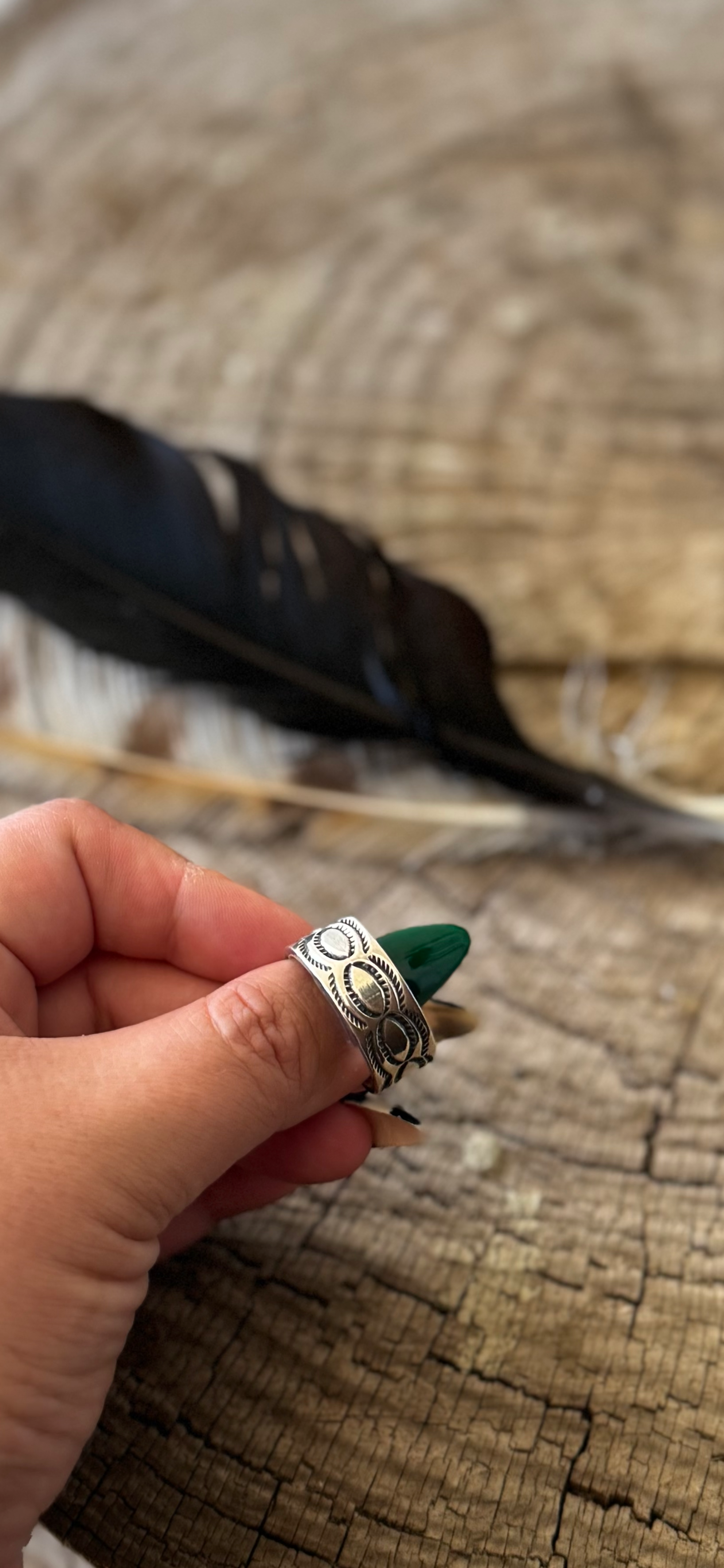 This handcrafted sterling silver ring, inspired by traditional cigar bands, showcases the artistry of JG. Designed in size 11.5, it offers a unique blend of cultural heritage and timeless style. Perfect for those who appreciate meaningful, native-inspired jewelry that stands out with subtle elegance.