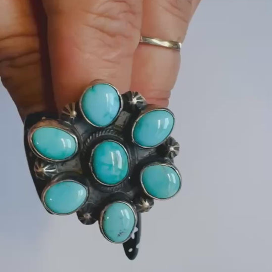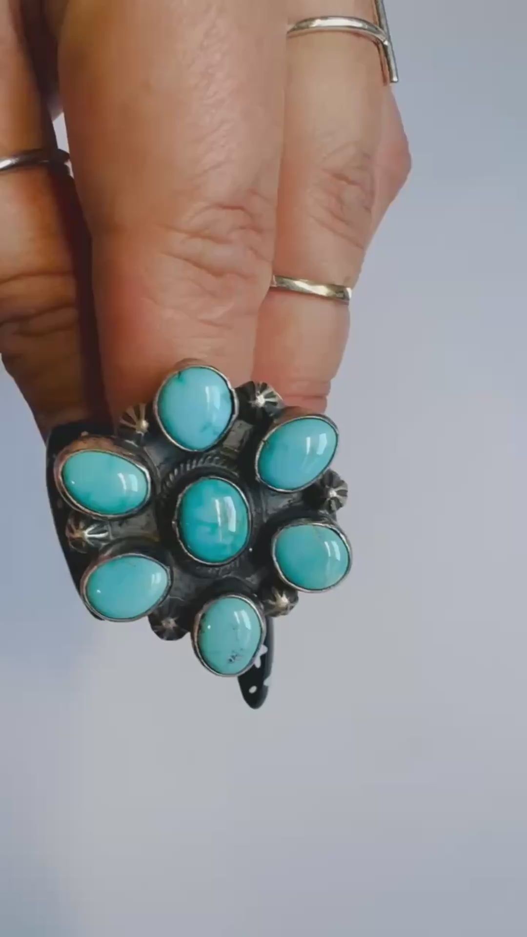 Adorn your fingers with this playful Cluster Turquoise Ring! Handcrafted by Native artist Kathleen Livingston, this size 8 sterling silver beauty features 7 subtly arranged turquoise stones that dance together in perfect harmony. Each stone showcases the mesmerizing blue-green hues that turquoise is famous for. A wearable piece of art that adds a pop of color to any outfit!