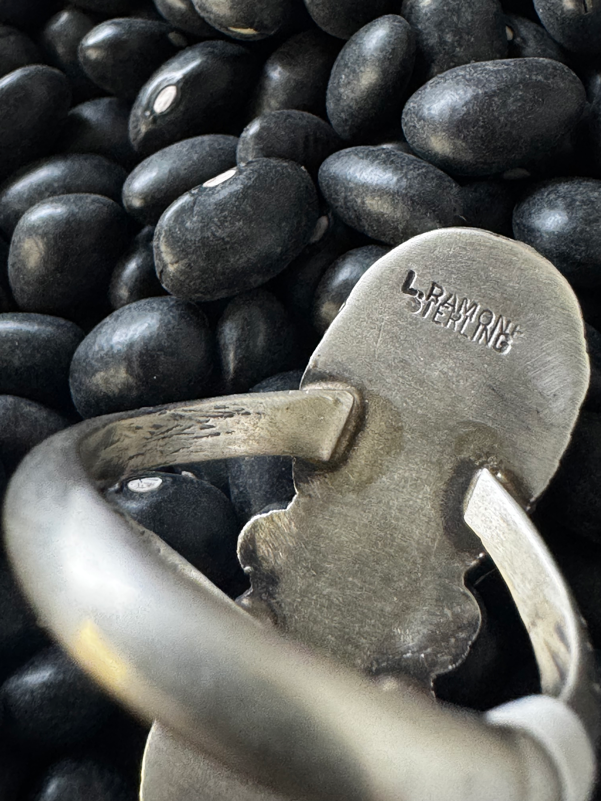 Adorn your fingers with this playful double-stone ring featuring vibrant Sonoran Gold Turquoise set in gleaming sterling silver. Handcrafted by Native artist L. Ramon, this size 8.75 statement piece brings twice the sparkle and twice the fun to your jewelry collection. Each unique creation tells a story through traditional craftsmanship with a modern twist!