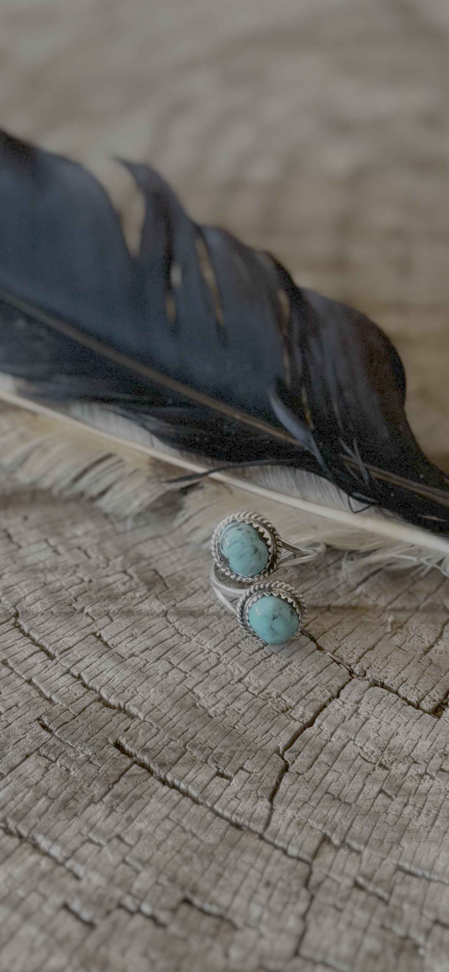 Experience the unique charm of this Dual Stone Ring featuring vibrant Kingman Turquoise set in sterling silver. Handcrafted by Native artist Esther White, each piece reflects authentic artistry and cultural heritage. The size-adjustable design ensures a perfect fit, making it a versatile addition to your collection. Elevate your style with a meaningful accessory that blends natural beauty and skilled craftsmanship.