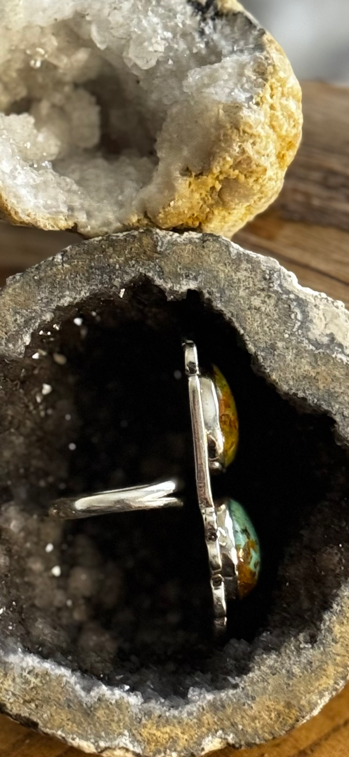 Elevate your style with this striking Dual Stone Ring featuring authentic Kingman turquoise set in polished sterling silver. The vibrant turquoise stones add a bold, natural touch to any outfit. Perfect for those who appreciate handcrafted elegance and timeless beauty, this ring brings a unique blend of color and sophistication to your jewelry collection.