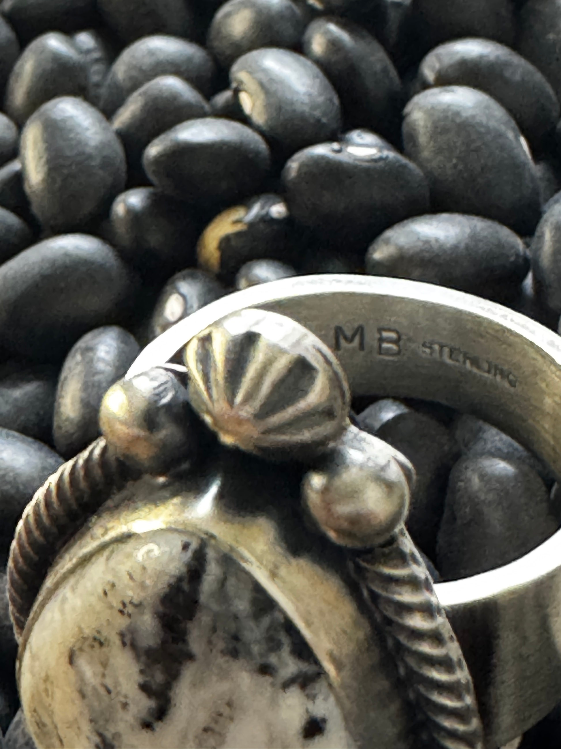 Large Ring - White Buffalo - Sterling Silver - Native Handmade - MB (artist) - Size 9.75