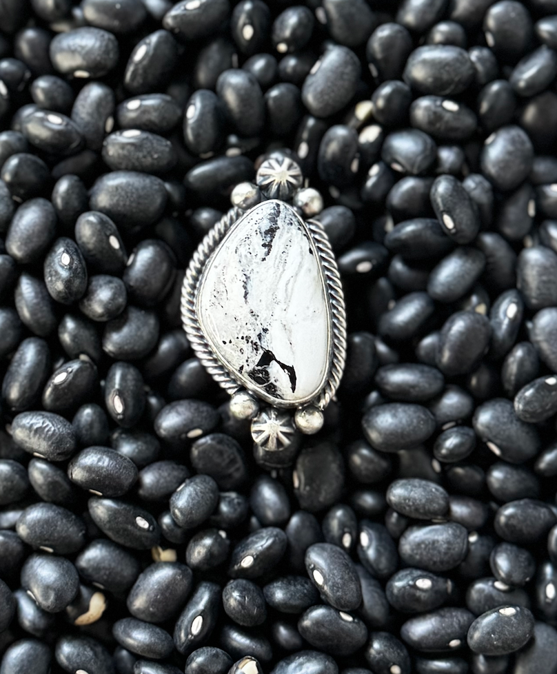 Adorn your fingers with this eye-catching White Buffalo ring, handcrafted by Native artist MB! This size 9.75 beauty features a generous stone setting nestled in gleaming sterling silver. Perfect for making a statement or adding a touch of artistic flair to any outfit. Each ring is uniquely crafted, making it as individual as you are!