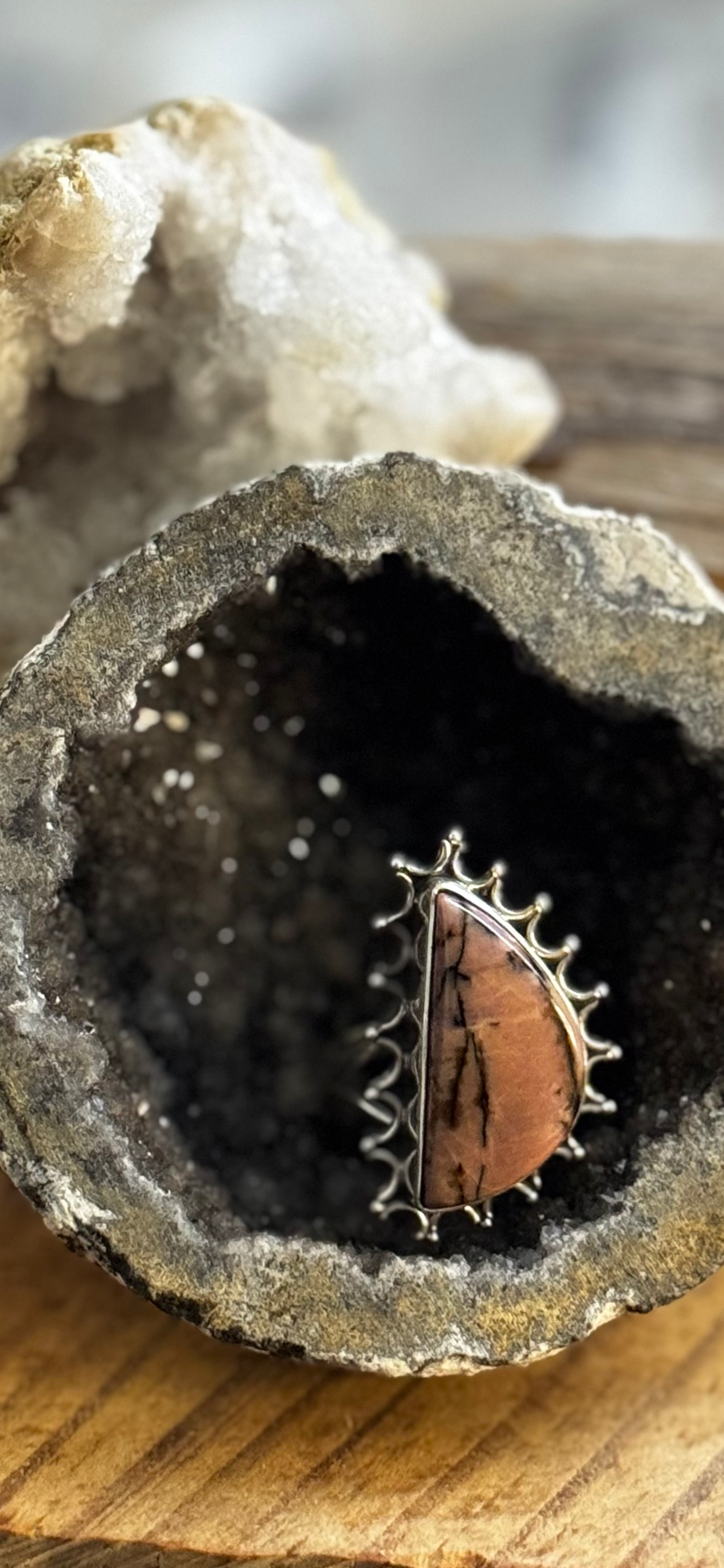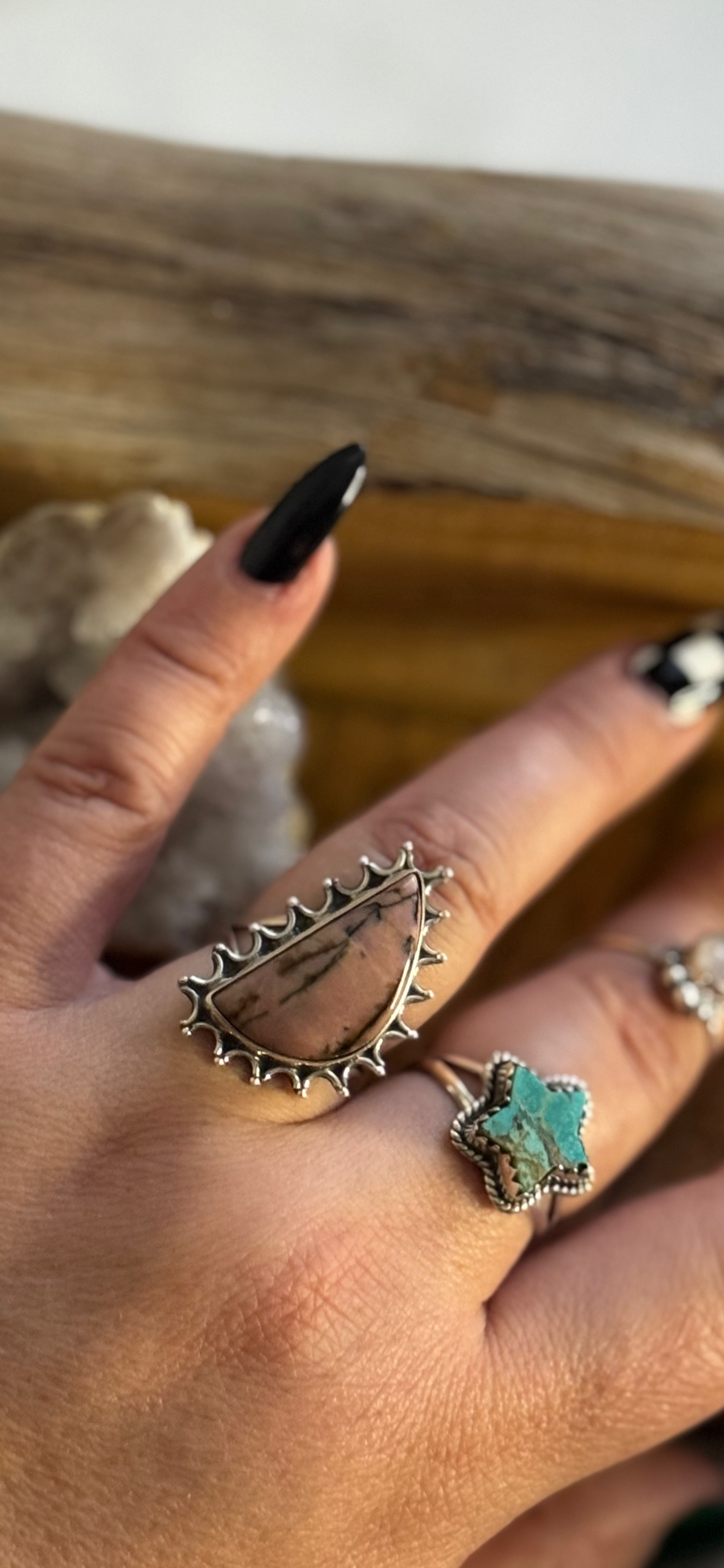 Crafted from sterling silver, this ring showcases a stunning rhodonite stone that captivates with its unique pink hues. Sized at 8.5, it fits comfortably while adding an elegant touch to any outfit. Perfect for those seeking a distinctive accessory that combines natural beauty with timeless craftsmanship.