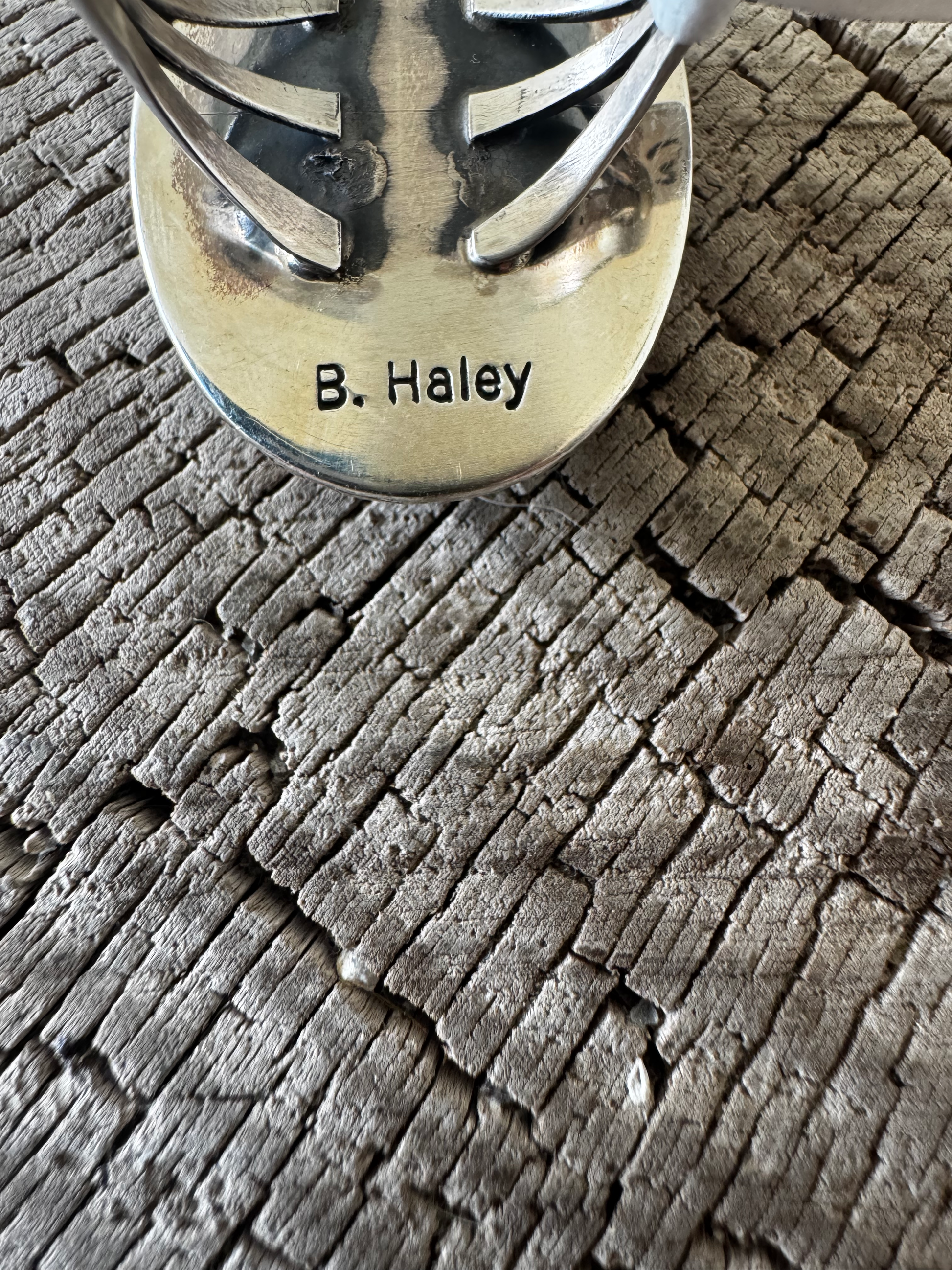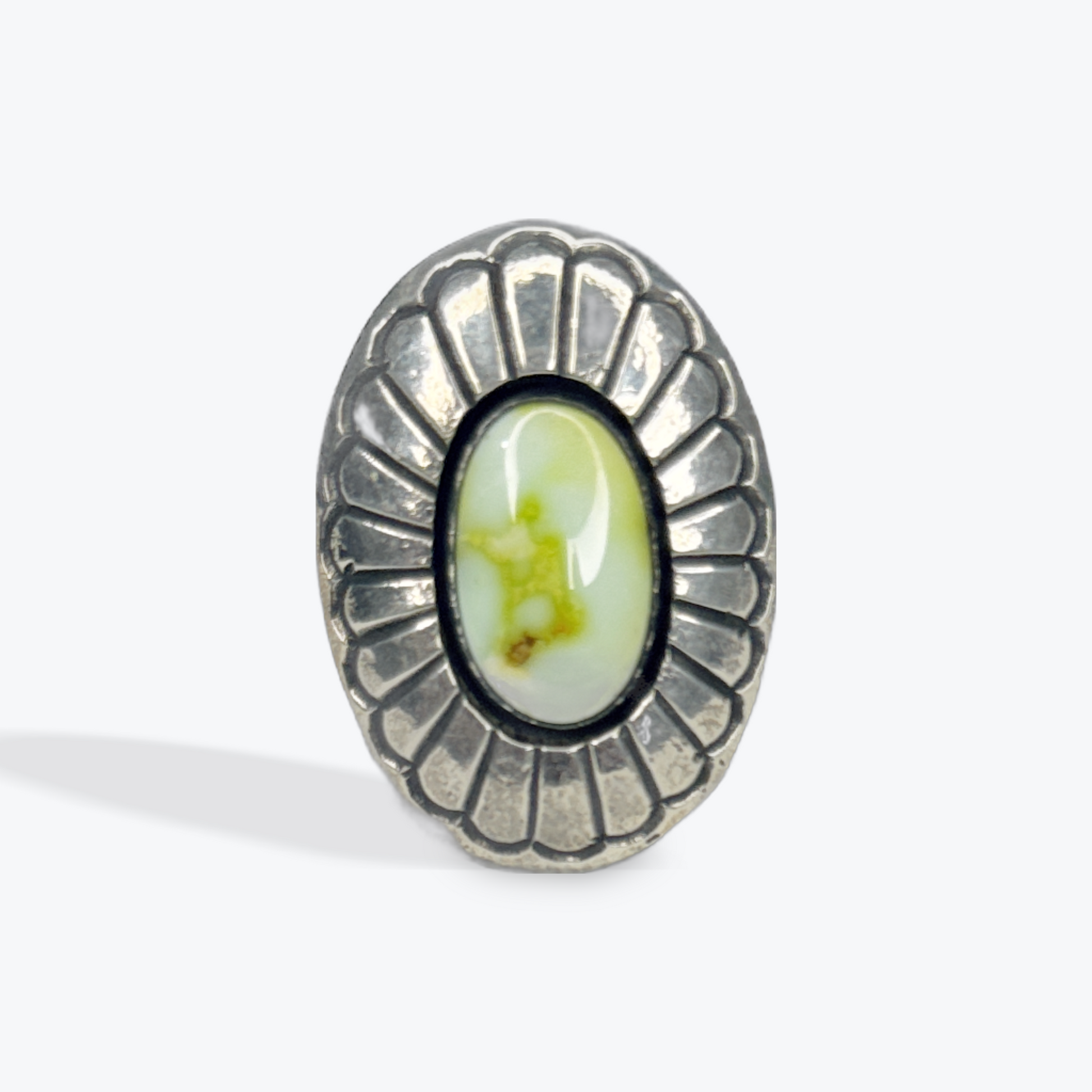 Adorn your fingers with this playful Oval Concho Ring featuring a rare Palomino Turquoise stone that whispers stories while making statements! Handcrafted by Native artist B. Haley in sterling silver, this size 10 beauty combines traditional craftsmanship with a pop of natural color that'll have everyone asking, "Where'd you get that gorgeous ring?"
