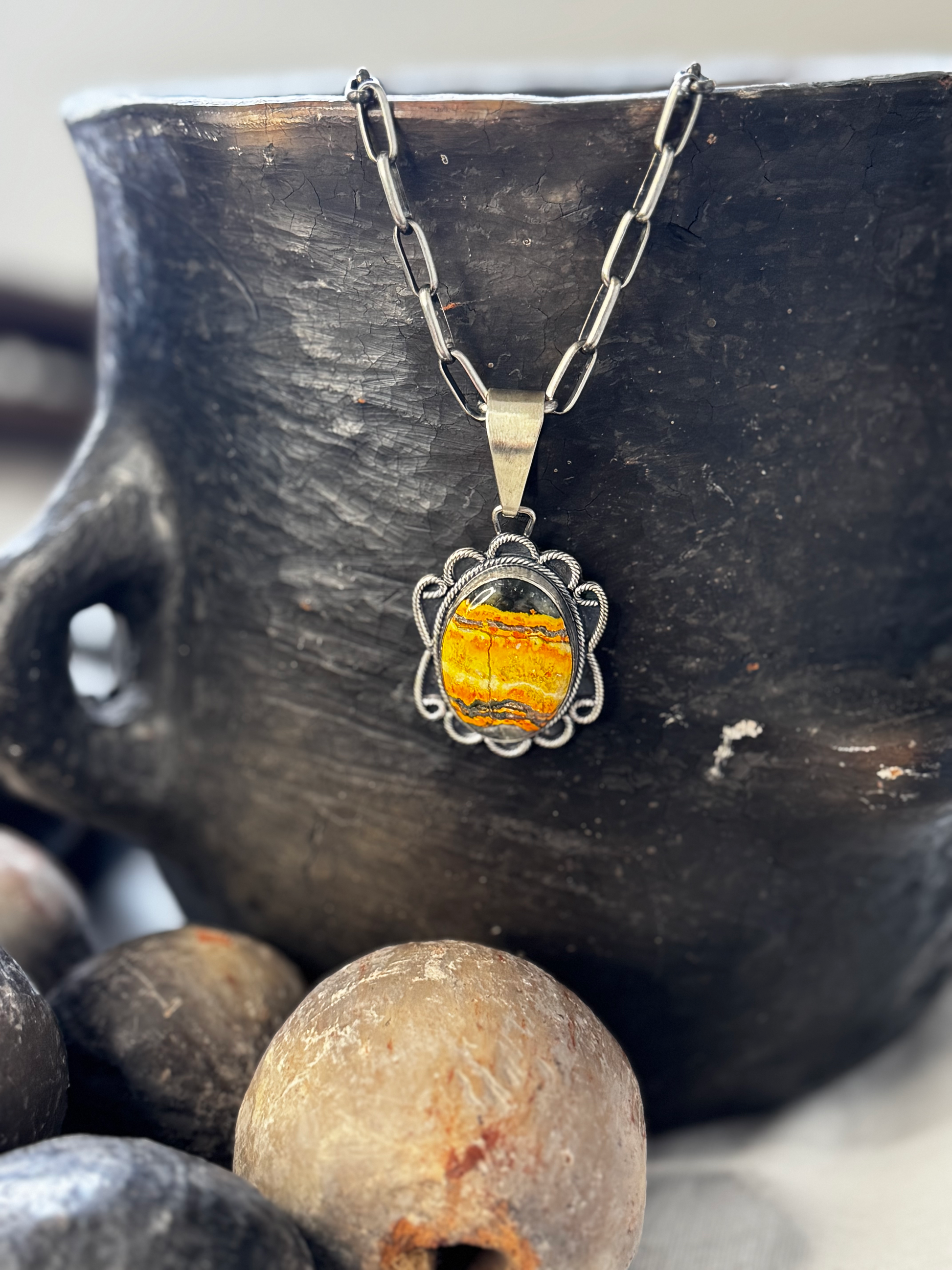 Adorn yourself with this whimsical oval pendant featuring playful ruffles and striking Bumblebee Jasper! Handcrafted by Native artist David Henio, this sterling silver treasure combines traditional craftsmanship with a splash of fun. The vibrant stone's natural patterns dance like busy bees, making this piece a conversation starter that'll have everyone buzzing with compliments!