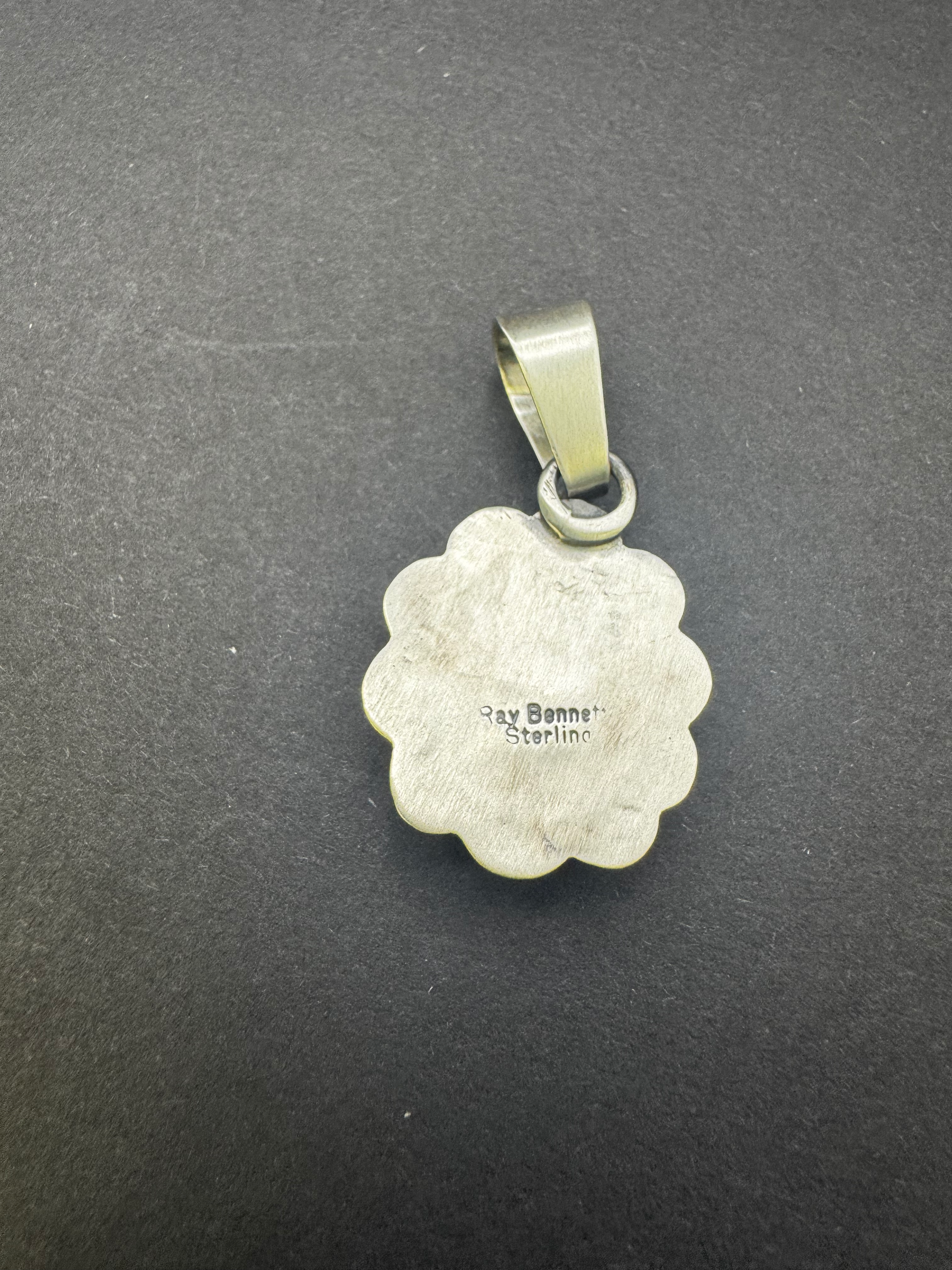 Adorn yourself with this playful round pendant featuring whimsical scalloped edges! Handcrafted by Native artist Ray Bennet, this sterling silver beauty showcases vibrant turquoise that catches every eye. Each pendant is uniquely made with traditional techniques, adding a splash of artistic flair to any outfit. A treasure that tells a story!