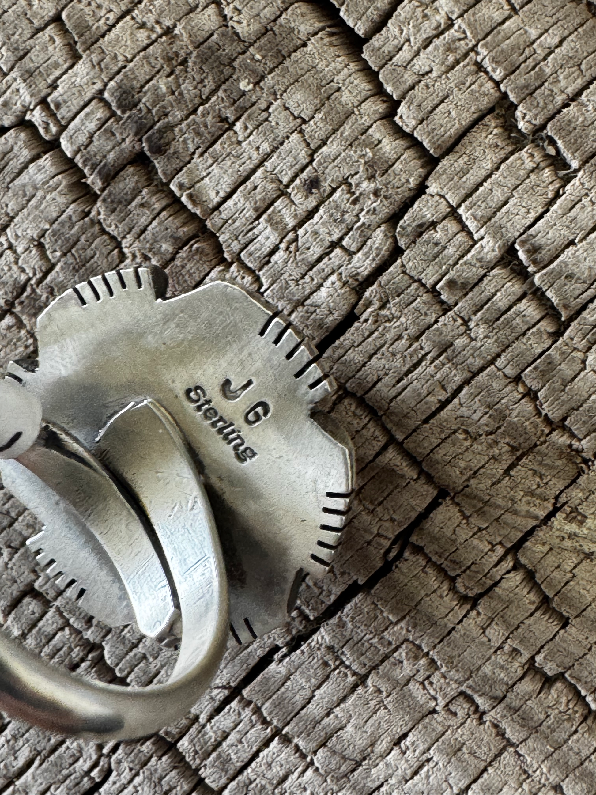 Adorn your fingers with this playful round ring featuring a vibrant orange spiny oyster set in gleaming sterling silver. Handcrafted by Native artist JG, this adjustable statement piece brings a pop of color to any outfit. The perfect blend of traditional craftsmanship and contemporary style that fits just right, every time!