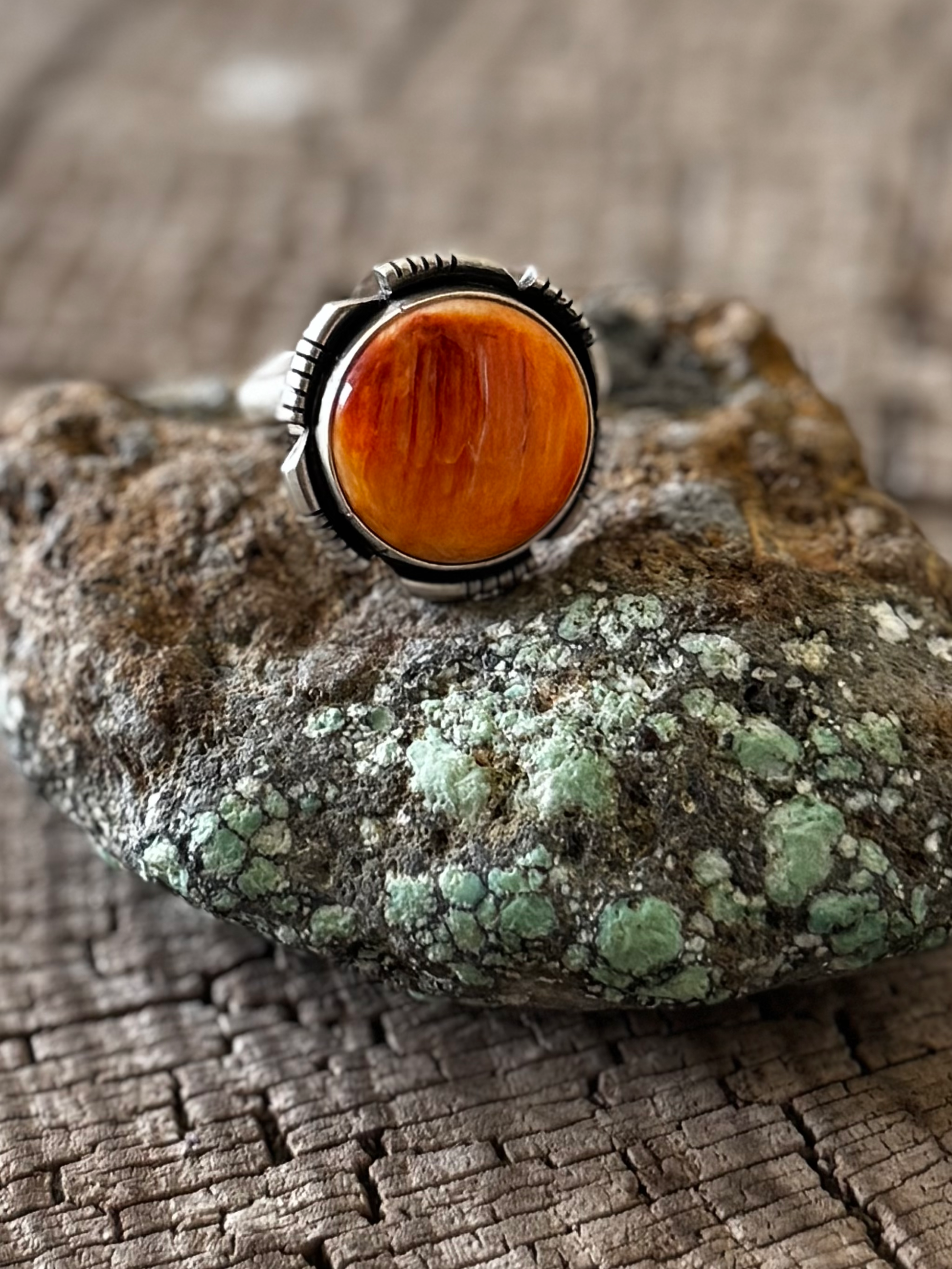 Round Ring—Orange Spiny Oyster—Sterling Silver—Native Handmade—JG (artist)—Size Adjustable