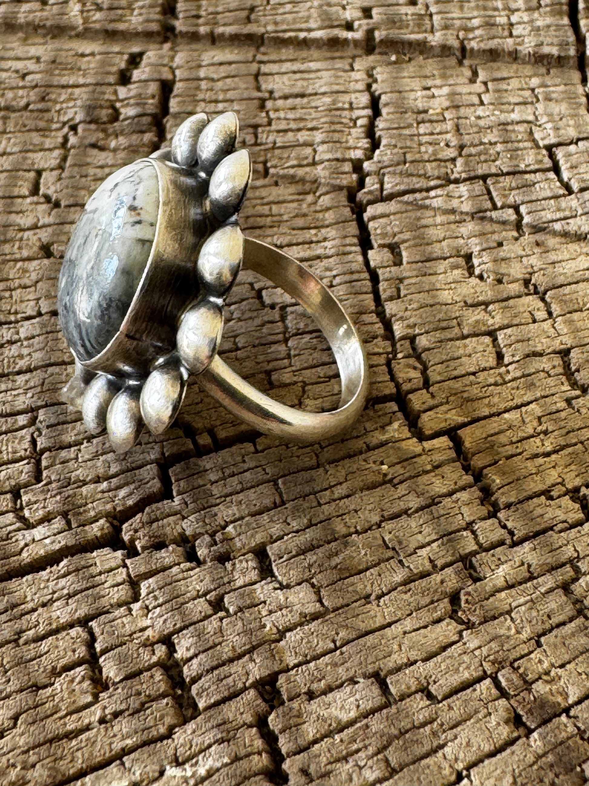 Embrace the sun's energy with this playful, round, sun-shaped ring featuring authentic White Buffalo turquoise. Meticulously handcrafted by Navajo artist "T" using genuine sterling silver, this adjustable statement piece brings southwestern charm to any outfit.