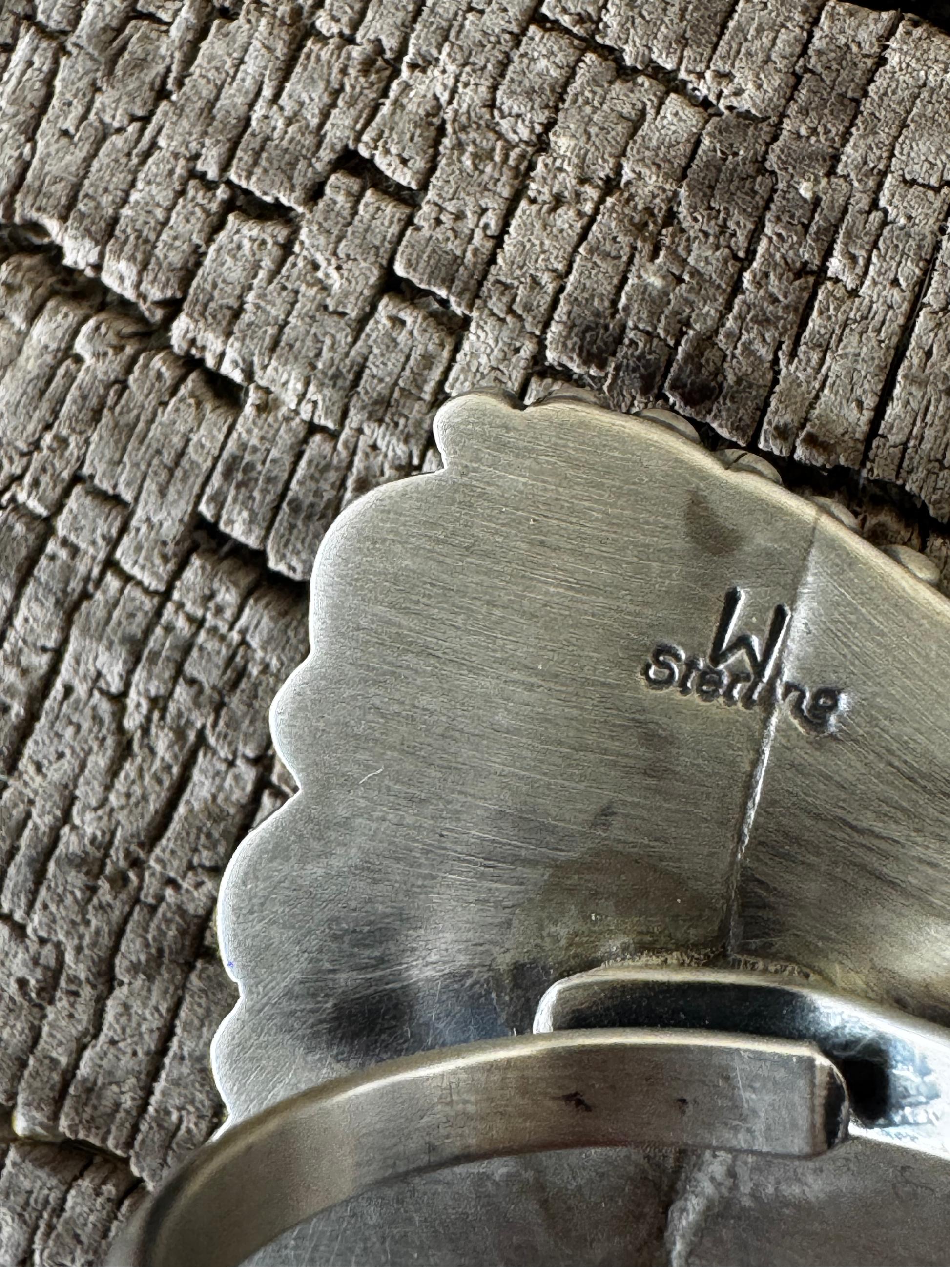 Adorn your fingers with this playful trapezoid-shaped ring featuring genuine Royston Turquoise! Handcrafted by Native artist M, this sterling silver beauty adjusts to fit your finger perfectly. The unique geometric design adds a fun twist to traditional turquoise jewelry—making it the perfect conversation starter at your next gathering!